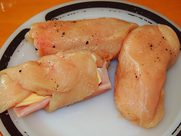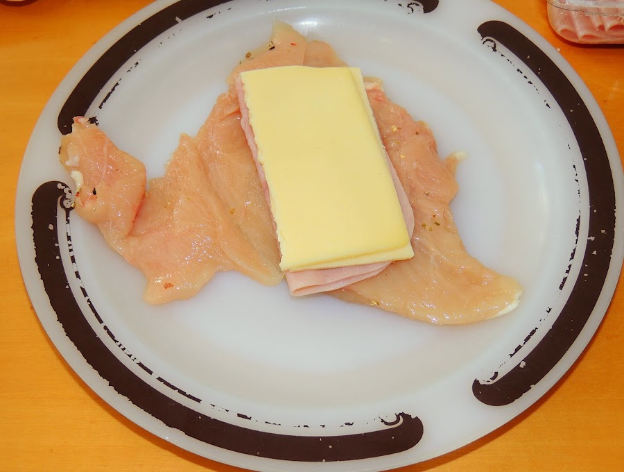 Se salpimientan las pechugas por las dos caras. Es mejor que las pechugas sean finas para que se enrollen fácilmente. A continuación, se pone una loncha de jamón doblada por la mitad y otra que queso también doblada.