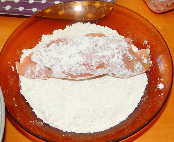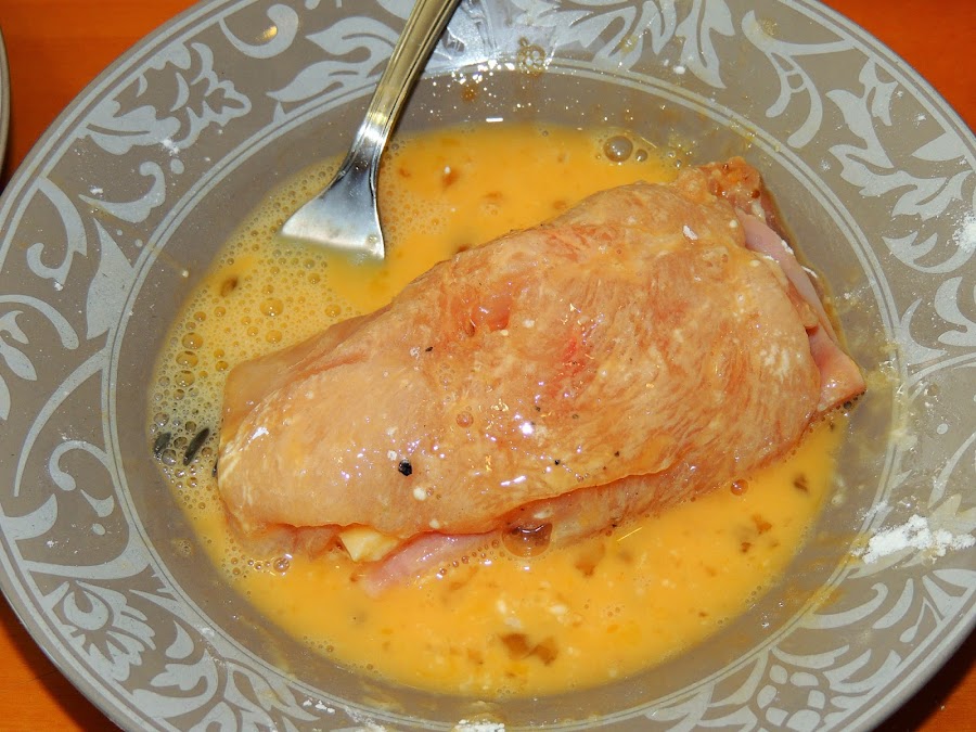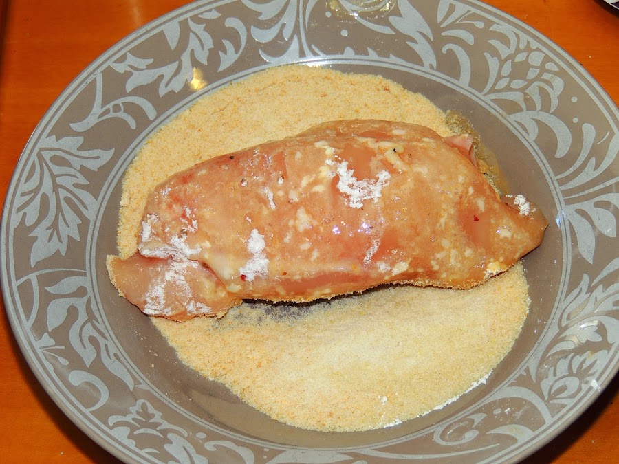 Y finalmente se pasa por el pan rallado. Este rebozado hay que hacerlo con cuidado apretando la pechuga para que no se desenrolle.