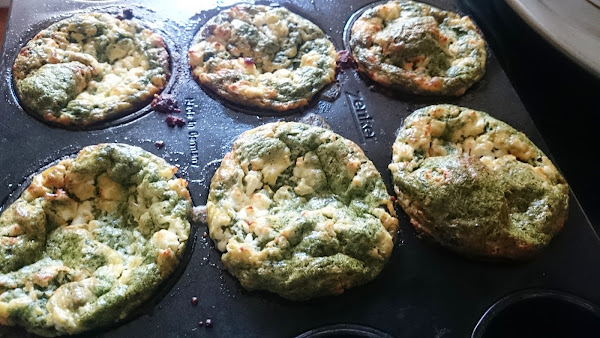 Ponemos los huevos, el tomate, las espinacas, la nuez moscada, la sal y la pimienta en una jarra grande y batimos hasta que los ingredientes queden mezclados. Repartimos la mezcla uniformemente en los 8 orificios para muffins de la bandeja y espolvoreamos por encima el queso feta.