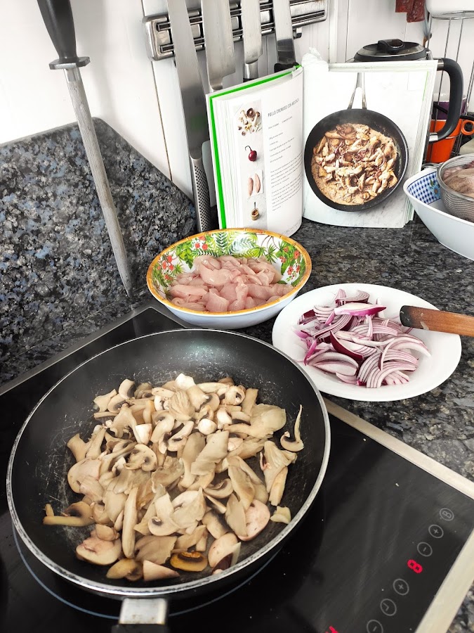 Ponemos una sartén antiadherente de 30 cm a fuego medio-fuerte. Troceamos las setas más grandes y las incorporamos todas a la sartén, sin aceite. Dejamos que se doren y desprendan su aroma a frutos secos, removiendo de vez en cuando. Mientras, pelamos la cebolla y la cortamos en rodajas finas, cortamos las pechugas de pollo en tiras de 1 cm de grosor.