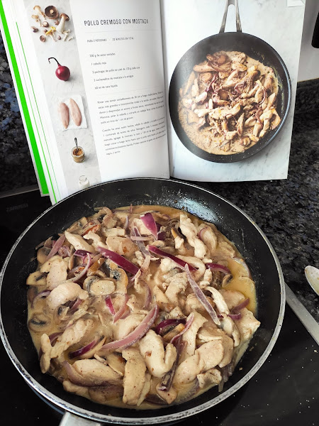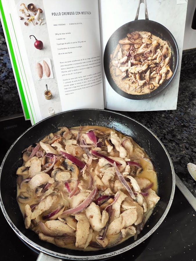 Cuando las setas estén hechas, añadimos la cebolla y el pollo a la sartén con 1 cucharada de aceite de oliva. Rehogamos todo 5 minutos, removiendo a menudo, agregamos la mostaza, la nata (crema de leche) y el agua o caldo. Llevamos a ebullición, luego cocemos a fuego lento hasta que el pollo esté hecho y la salsa tenga una consistencia bastante líquida. Probamos, sazonamos al gusto con sal y pimienta negra y servimos.