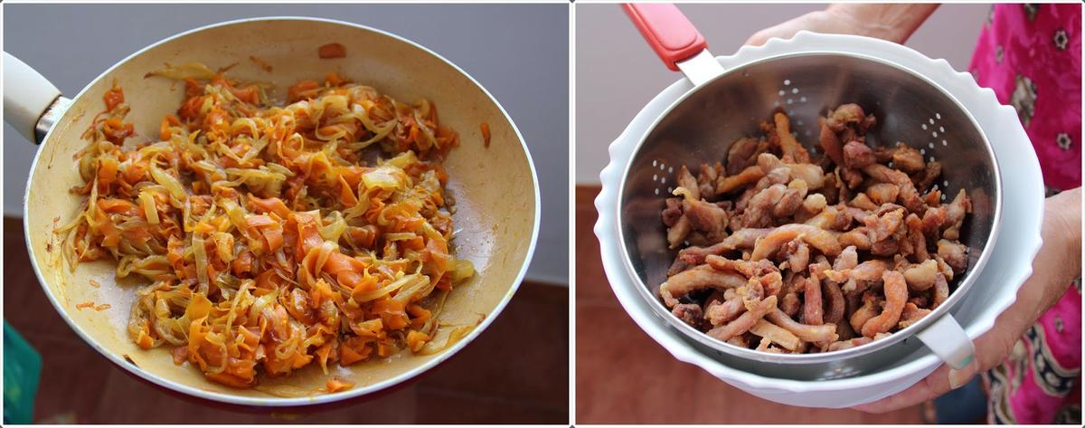 Cortar la cebolla en láminas y la zanahoria con un pelapatatas en tiras y poner en una sartén juntos con un poco de aceite de oliva (pochar) y hacer lentamente. Primero ponemos más fuerte y cuando libere el agua lo bajamos.
