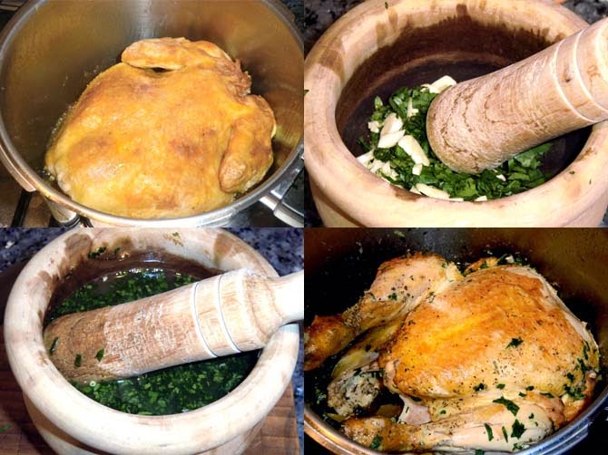 Cuando tenemos el pollo muy dorado agregamos la majada junto con el vinagre, el vino y las hierbas.