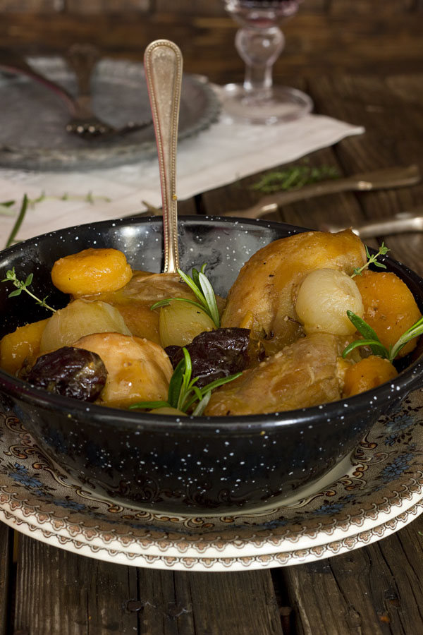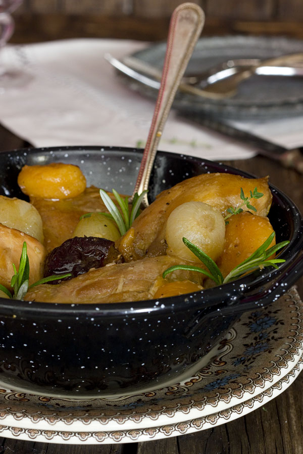 Agregamos el brandy y flambeamos hasta que se apague la llama. Añadimos entonces el caldo reservado justo hasta cubrir el pollo y añadimos las ciruelas, los orejones, el romero y el tomillo. Cuando empiece a cocer, bajamos el fuego para que se haga de manera lenta.
