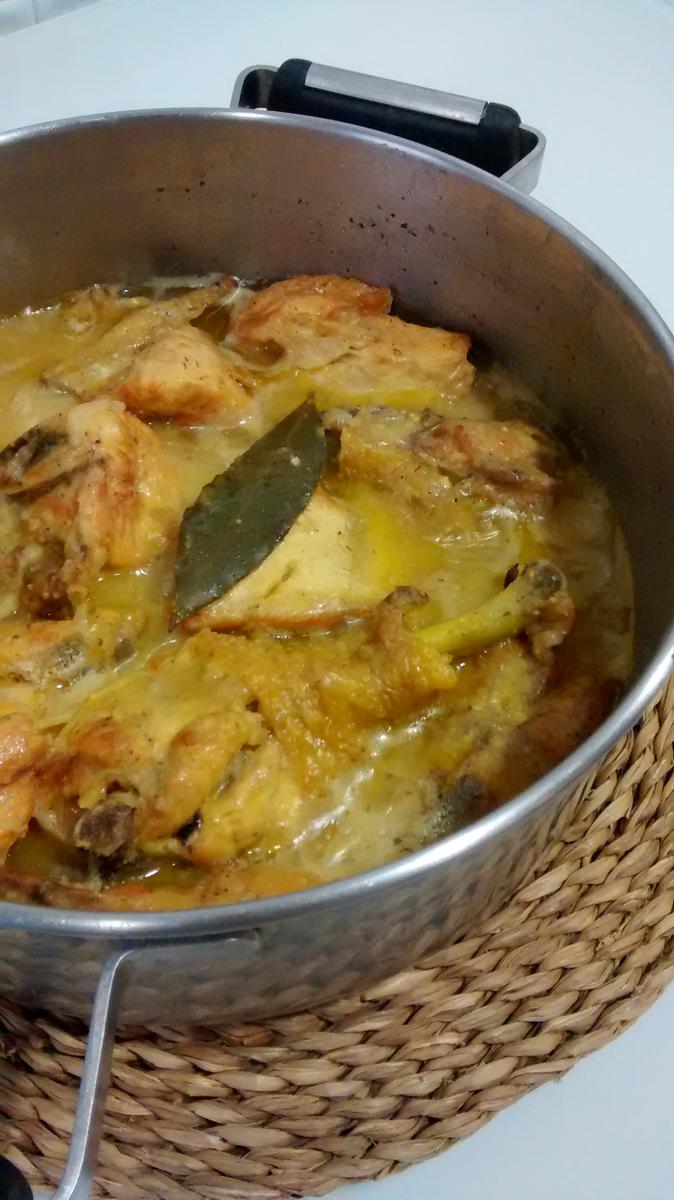 Poned el pollo en la cazuela en la que ya estará a punto la cebolla y el ajo e incorporáis el pollo y el vaso de vino. Lo mantenéis a fuego lento hasta que se reduzca el vino y añadís entonces el caldo de forma que cubra la carne.