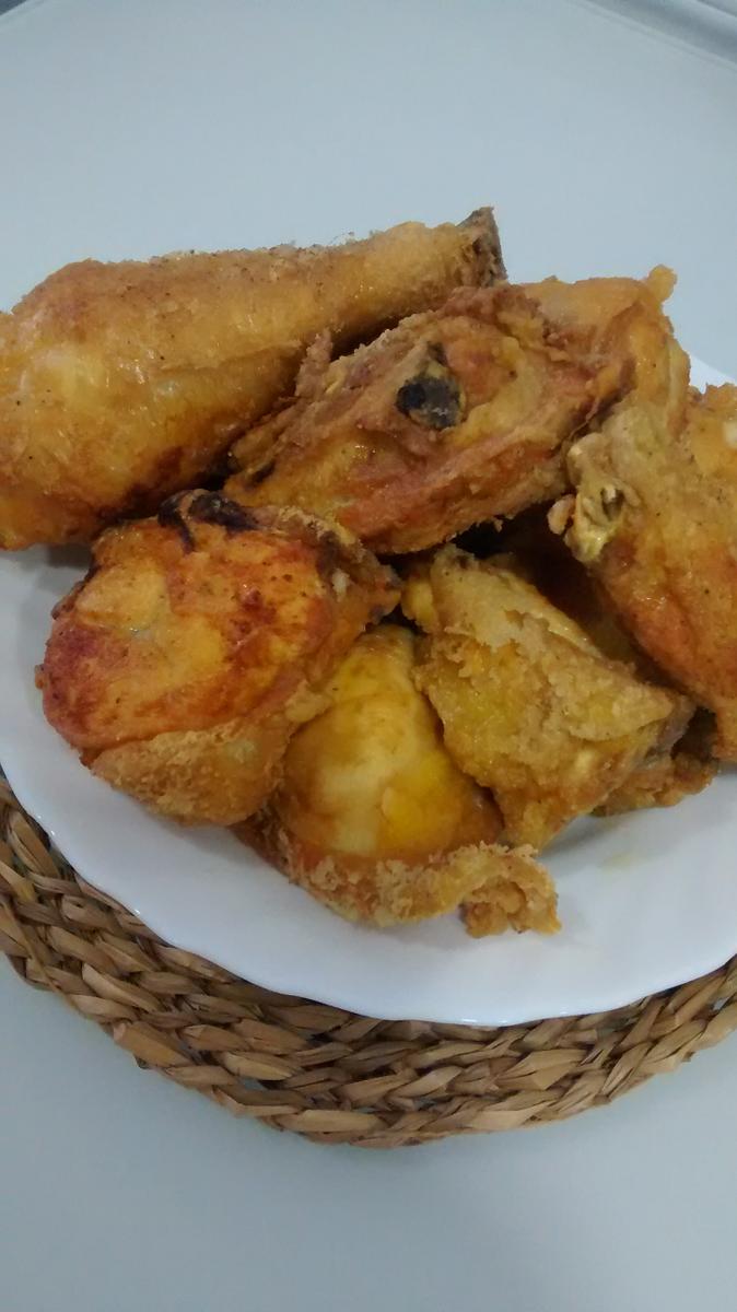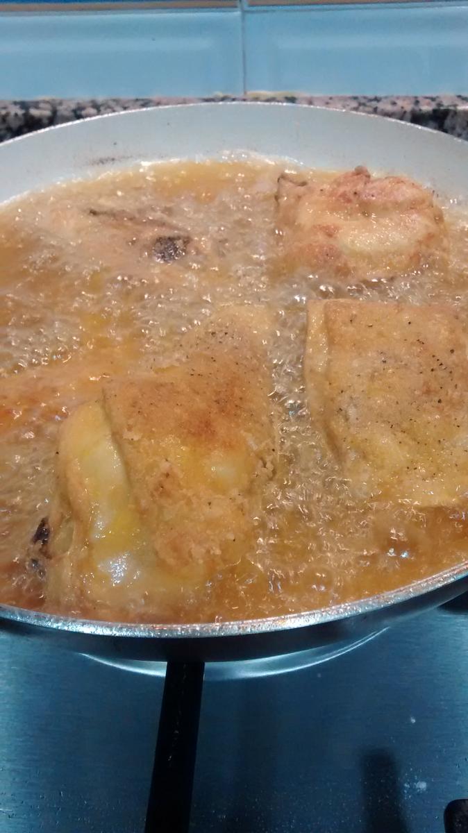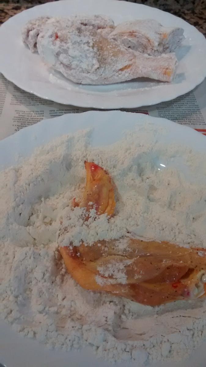 En una sartén o cazuela con abundante aceite de oliva muy caliente dorad el pollo, previamente enharinado, procurando que los trozos se hagan bien por todas partes. Sacadlo y lo reservadlo.