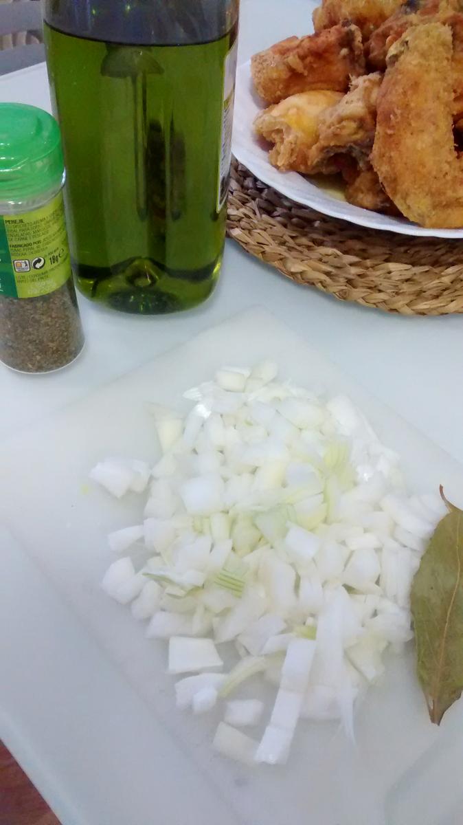 Mientras se va dorando el pollo trocead la cebolla y los ajos en trocitos muy pequeños (aproximadamente de 0,5 mm). Lo echáis a la cazuela donde vayais a cocinarlo posteriormente y lo sofreís durante unos 10 o 15 minutos a fuego medio-lento.