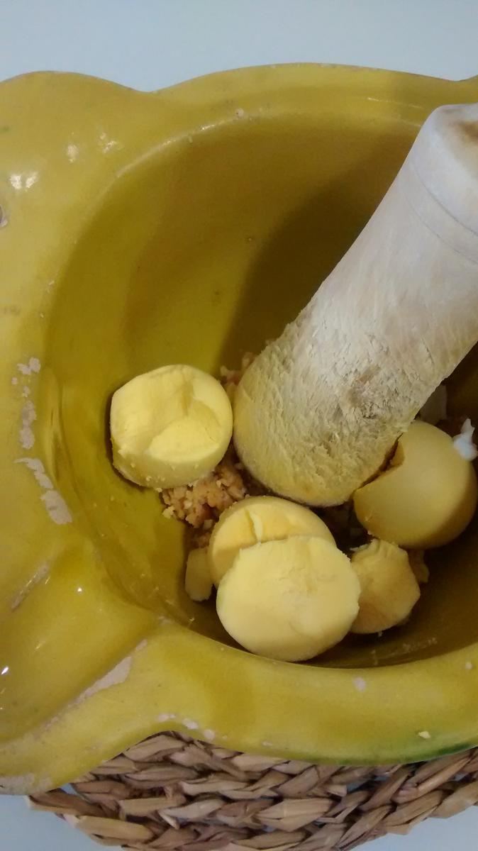 En un mortero poned las almendras y las yemas cocidas y unas hojas de perejil y lo machacáis todo hasta conseguir una pasta y le añadís un par de cucharadas del caldo. Lo echáis también a la cazuela.
