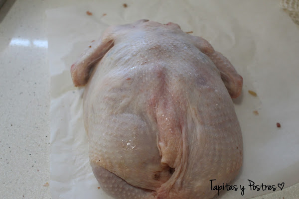 1 pollo entero deshuesado de alrededor de 2 kg o 25 kg (pedid a vuestro carnicero de confianza que os lo deshuese bien, en casa es complicado hacerlo).