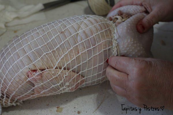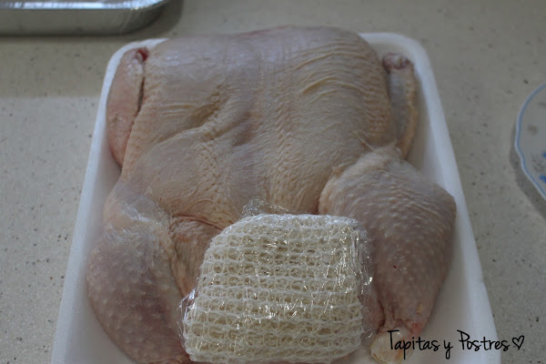 Una vez relleno el pollo, tendremos cuidado de que por los orificios abiertos del pollo no se nos salga el relleno. Para eso podemos o bien coserlo con hilo de cocina o poner unos palillos de madera. De todas maneras, el pollo va metido en una redecilla, por lo que esto no sería un problema. El problema es meterlo en la redecilla. Os aseguro que es la parte más difícil de la receta, pues una vez relleno el pollo adquiere un tamaño considerable y es algo complicado meterlo en las redecillas de cocinar que venden. Yo sola no pude, tuve que pedir refuerzos a mi vecina jajaja. Pero en la lucha, ganamos nosotras y el pollo al final entró en la redecilla.