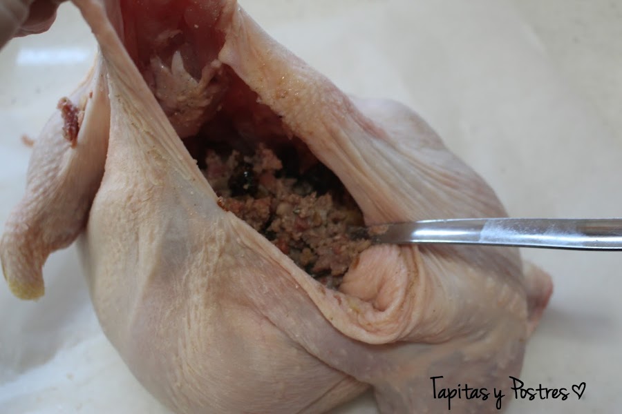 Salpimentamos bien por dentro el pollo e introducimos el relleno aplastando para que se cuele por todos los rincones. Yo os doy las cantidades que he usado pero en función del tamaño del pollo que compréis podéis necesitar algo más o algo menos.