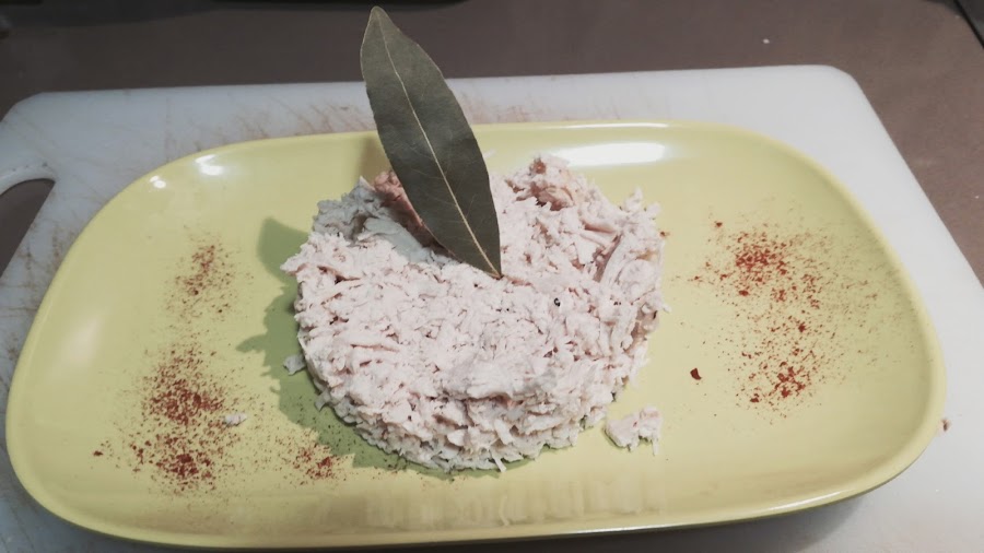 Calentamos en una olla el agua, cuando empiece a hervir echamos todos los ingredientes. Ponemos a fuego medio y dejamos unos 35 o 40 minutos. Sacamos el pollo dejamos enfriar, y desmechar con la ayuda de un tenedor. También se puede luego meter en un táper lo cerramos y lo agitamos y así también se desmenuza