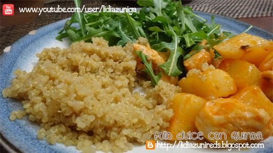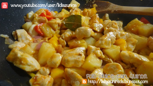Agregamos al pollo la cebolla, el ajo y dejamos que se cristalice la cebolla un poco, y agregamos la mezcla que preparamos con la ketchup, el resto de los ingredientes tapamos la cazuela y dejamos de 8 a 10 minutos a fuego lento y listo.Para la Quinoa