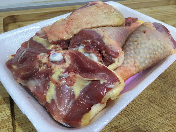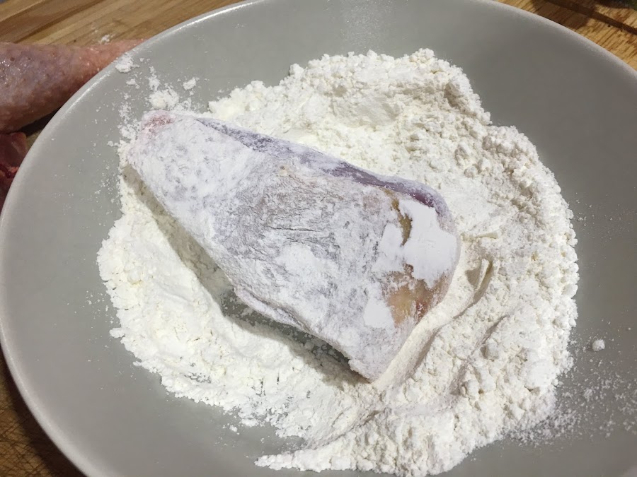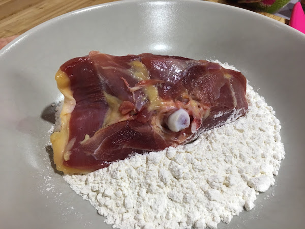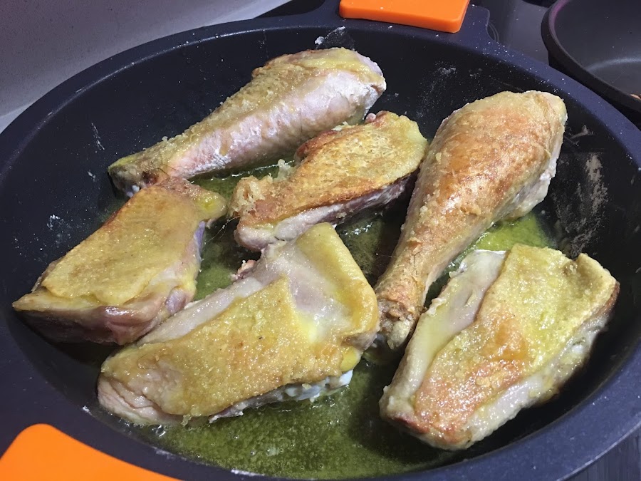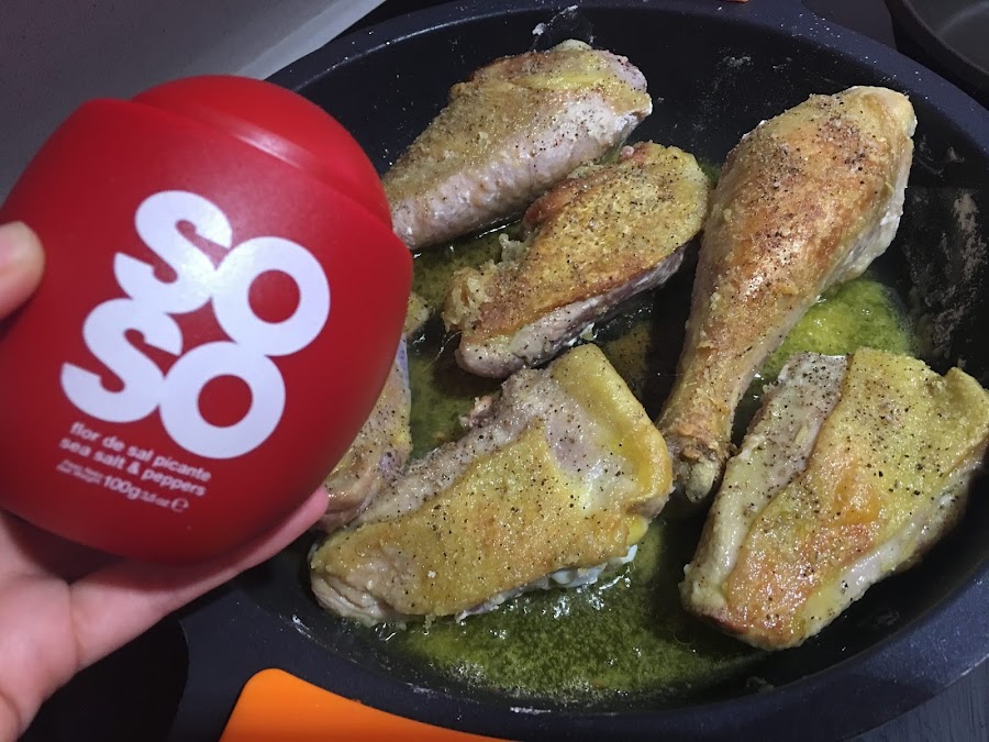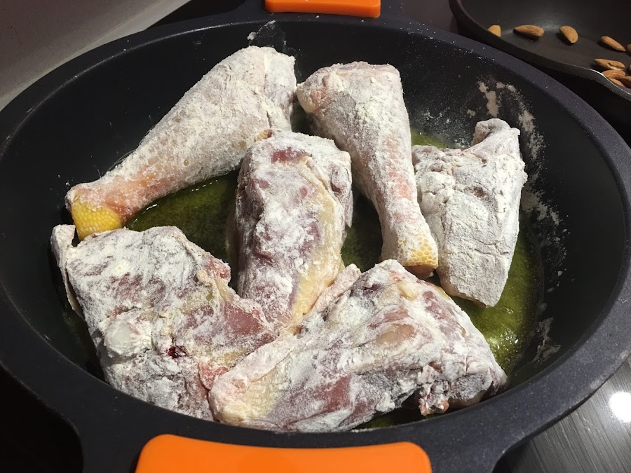 1. Para preparar este plato tan festivo he escogido un pollo ecológico, su carne nada tiene que ver con el pollo convencional, esta es rojiza, mas prieta y mucho más sabrosa. Pasamos los trozos de pollo por harina y sofreímos a fuego alto hasta marcarlos bien, deben quedar bien tostados. Salpimentamos con la Flor de sal SosoFactory.