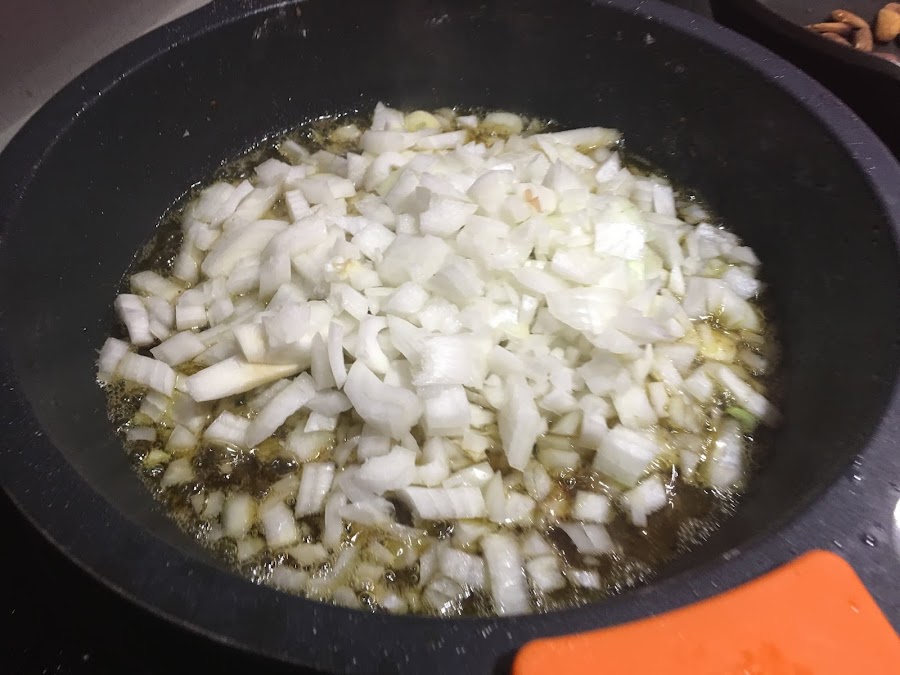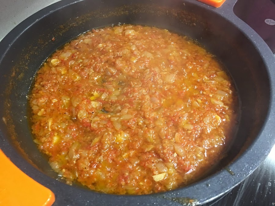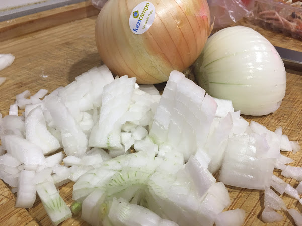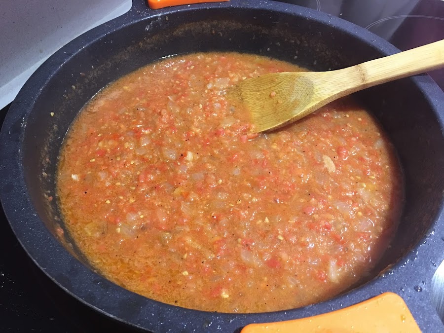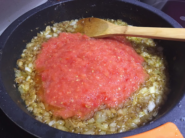 2. En el mismo aceite que hemos marcado el pollo, sofreímos las cigalas a fuego alto 2-3 minutos. Las sacamos y las reservamos. Cortamos en brunoise la cebolla blanca y la sofreímos 10-12 minutos hasta que tome un color doradito. A continuación añadimos el tomate triturado, yo le puse tres bien maduritos. Dejamos a fuego medio hasta que el tomate pierda toda el agua, alrededor de 20-25 minutos.