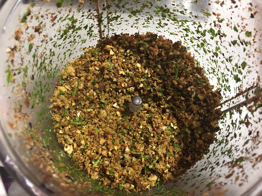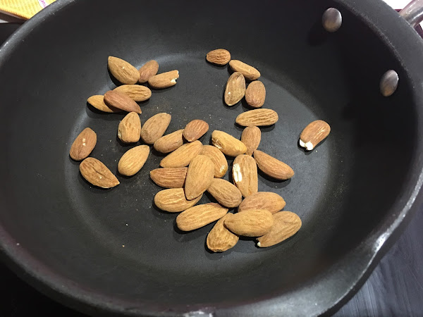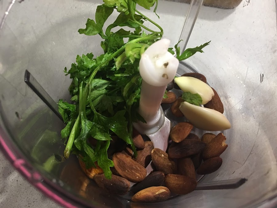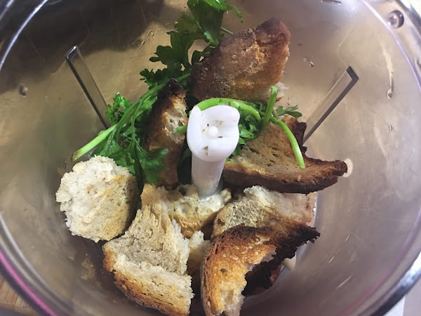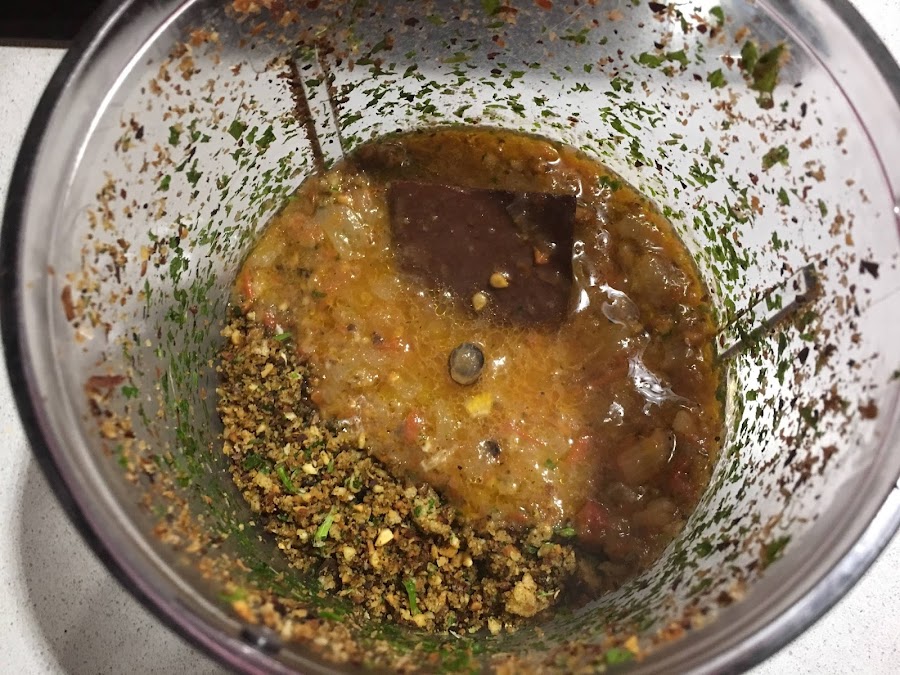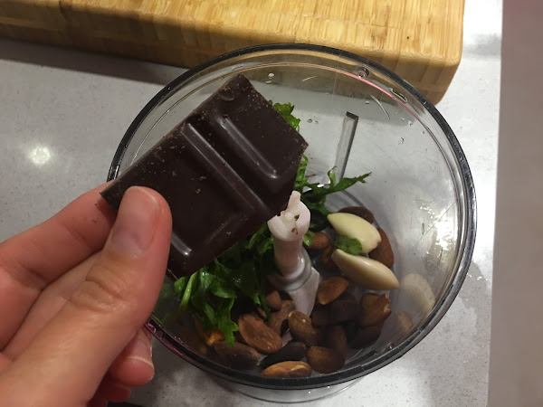 4. Mientras el tomate va reduciendo su agua preparamos la picada. Tostamos las almendras a fuego lento en una sartén. Cuando estén tostadas las añadimos al vaso batidor junto con los dos dientes de ajo, el perejil, el pan tostado, el higado frito y las dos onzas de chocolate negro La Chinata. Trituramos y ya tenemos nuestra picada a punto.
