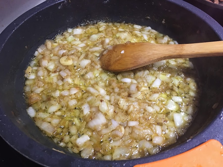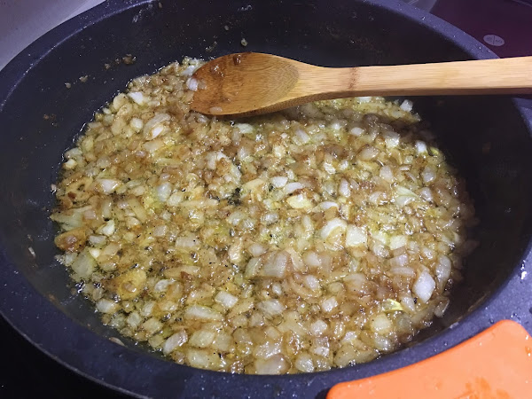 6. A continuación añadimos el caldo de pollo, hasta que prácticamente lo cubra todo. La receta del caldo de pollo la podéis ver aquí. Lo dejamos a fuego bajo durante 90 minutos.