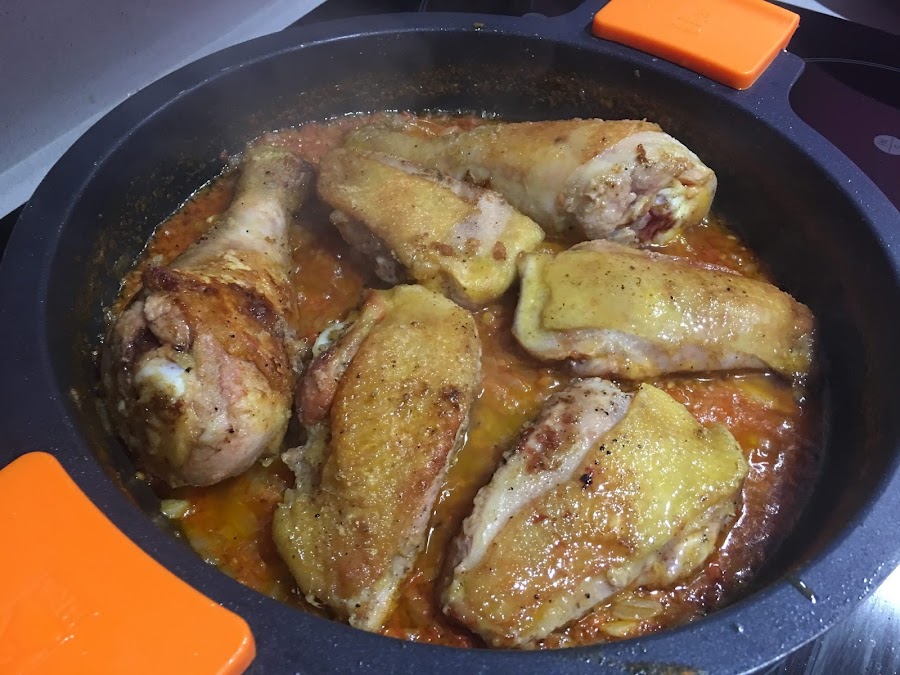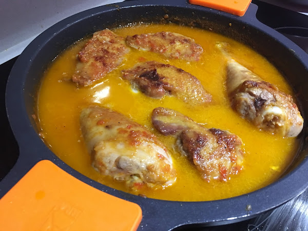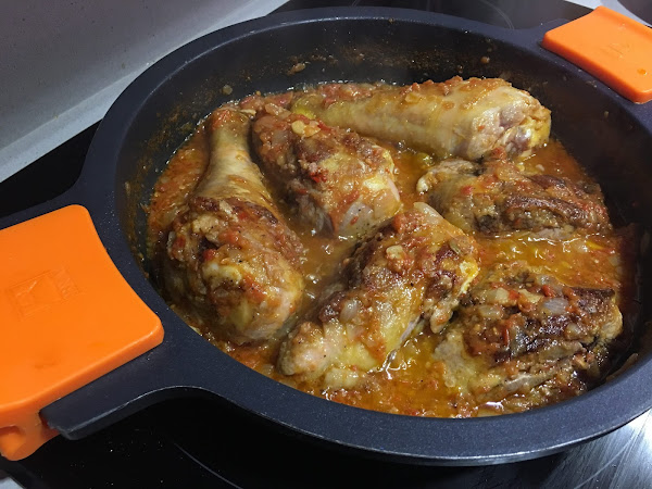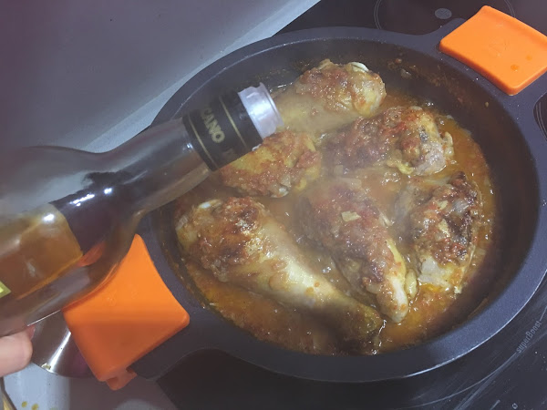 5. Cuando el tomate ya ha perdido toda su agua añadimos el pollo que teníamos reservado. Incorporamos el brandy, subimos el fuego y dejamos que evapore todo el alcohol.