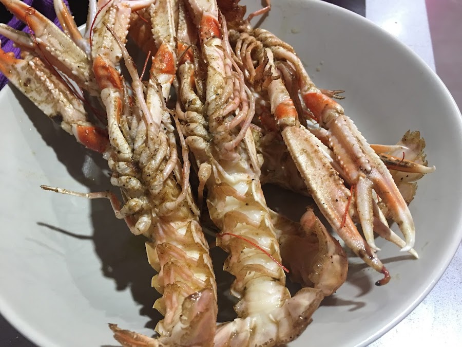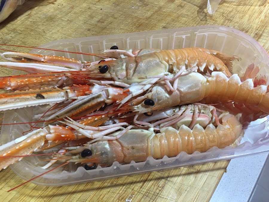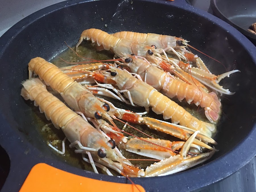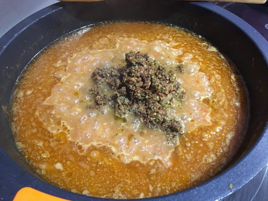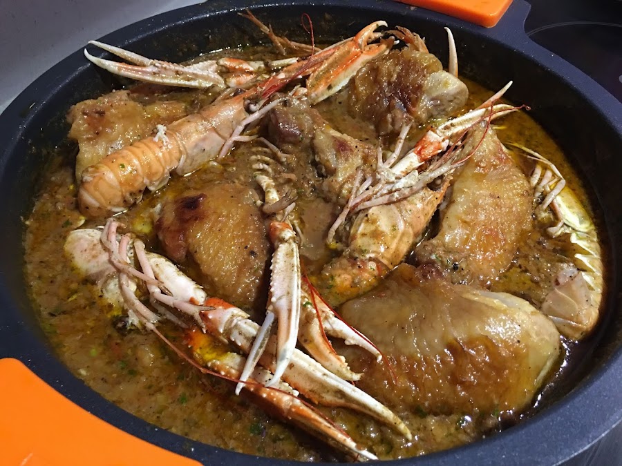 7. A los 60 minutos añadimos la picada, le añadimos un poquito de sofrito para que se deshaga bien el chocolate. A los 75 minutos. Agregamos las cigalas y dejamos que haga chup-chup los últimos 15 minutos.