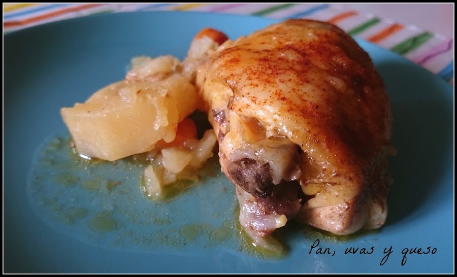 Echamos el sofrito en la Crock-Pot, encima colocamos el pollo dejando la piel hacia arriba y espolvoreamos un poco de pimentónsobre cada contramuslo.
