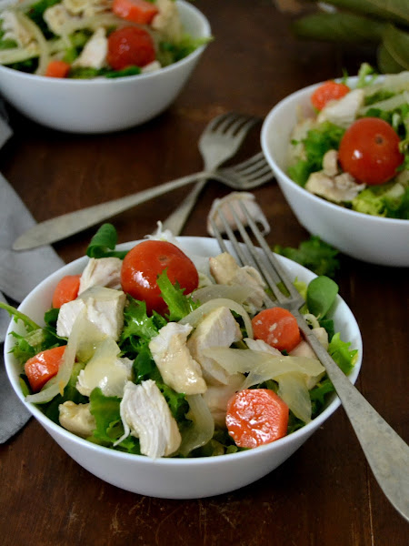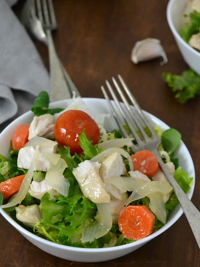 Mi propuesta ha sido un pollo en escabeche muy sencillo pero delicioso. Con sus verduritas y unos tomatitos cherry. Y para servirlo nada mejor que en forma de ensalada. Aunque con este tiempo que estamos teniendo quizás apetece más comerlo calentito.. ¡De las dos formas está espectacular!