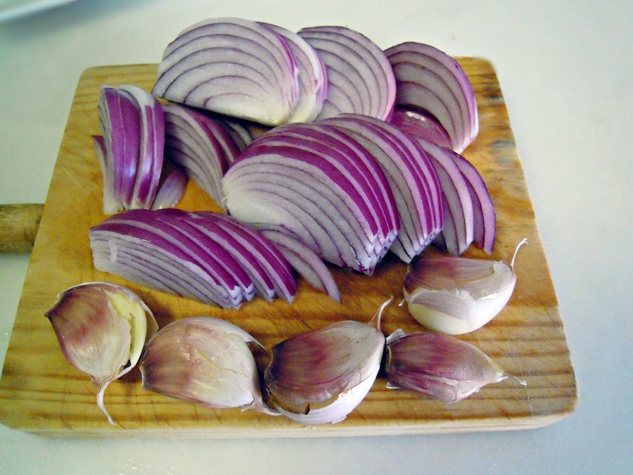 Cuando la carne esté dorada añade la cebolla y los dientes de ajo sin pelar y golpeados con la palma de la mano.