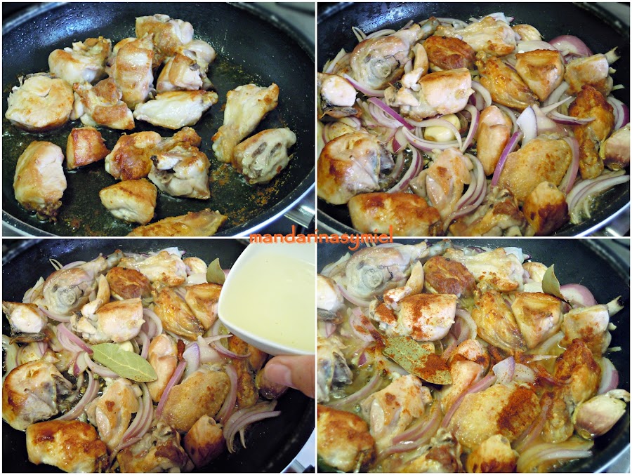 Pon una sartén o cazuela al fuego con aceite, cuando esté caliente añade el pollo sazonado y sofríe hasta que esté dorado.
