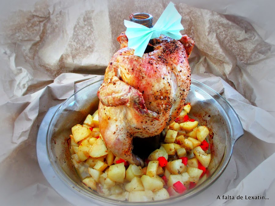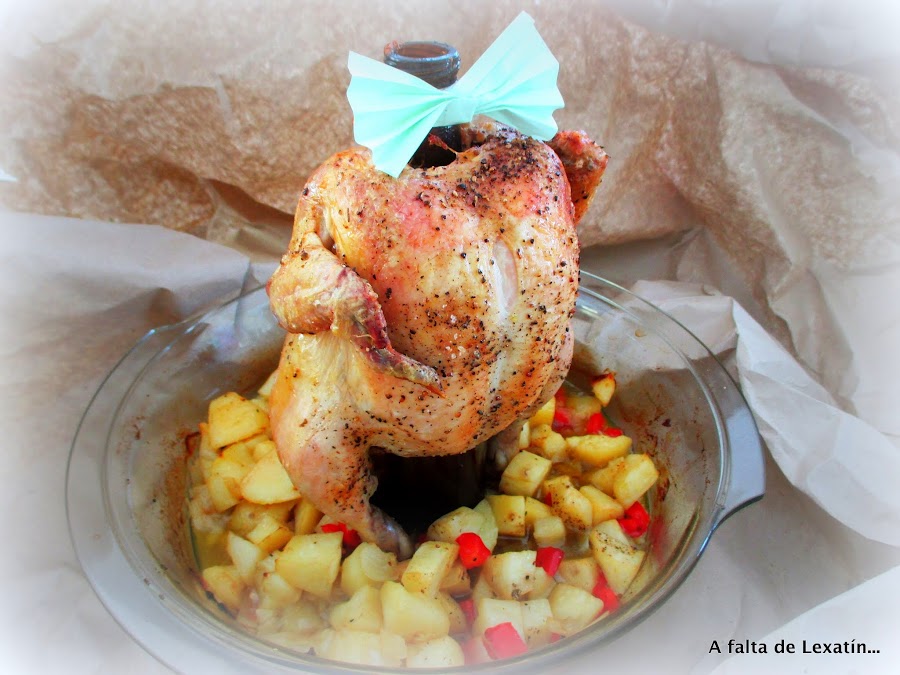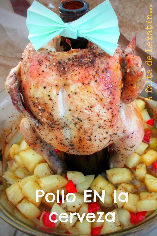 La idea de hacer el pollo así se la ví a Africa de "Recetas de la abuela Luisa", siempre tiene unas recetas estupendas pero ésta me hizo gracia por lo de presentar el pollo de esta forma y además es que queda superjugoso, la cerveza al hervir va saliendo poco a poco y regándolo y en esa postura queda jugoso y dorado uniformente, en casa nos ha encantado