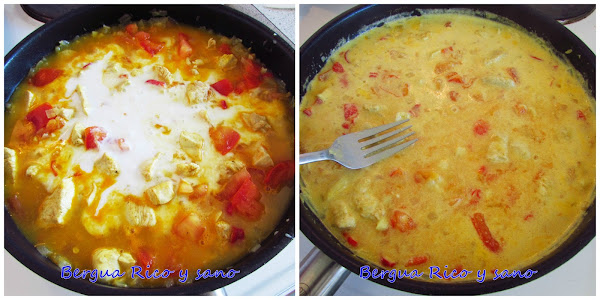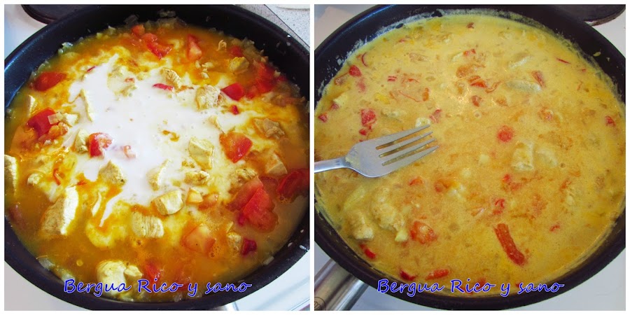 4. Entonces añadimos la leche de coco y lo dejamos cocer a fuego lento hasta que la salsa espese y el pollo esté hecho del todo, unos 30 minutos. A media cocción chafamos con un tenedor los trozos de tomate que veamos. Si la salsa está más líquida de lo que nos gustaría hacia el final, subimos el fuego para que se evapore más agua.