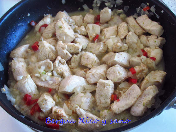 2. Pochamos la cebolla y el ajo picados en un poco de aceite y añadimos el pollo en dados. Cocinamos hasta que el pollo esté casi cocinado.
