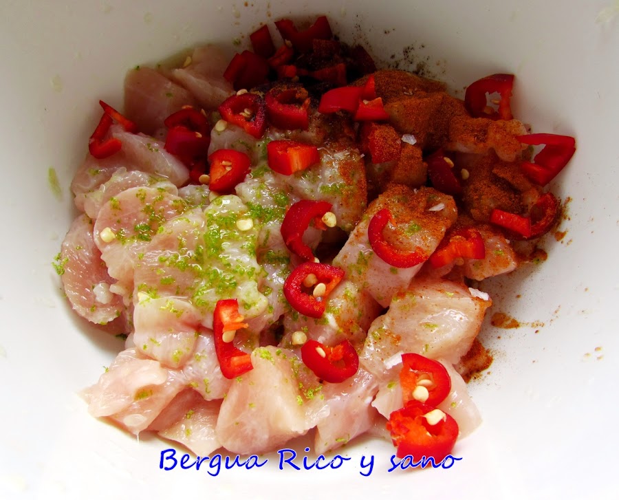 Le he dado a la receta un par de toques a mi gusto; por ejemplo he cambiado el limón por la lima, que es más dulzona, y le he añadido guindilla fresca además de pimienta de cayena. También he añadido una pizca de cúrcuma, que no afecta al sabor, pero le da un color genial. Para 2 personas: