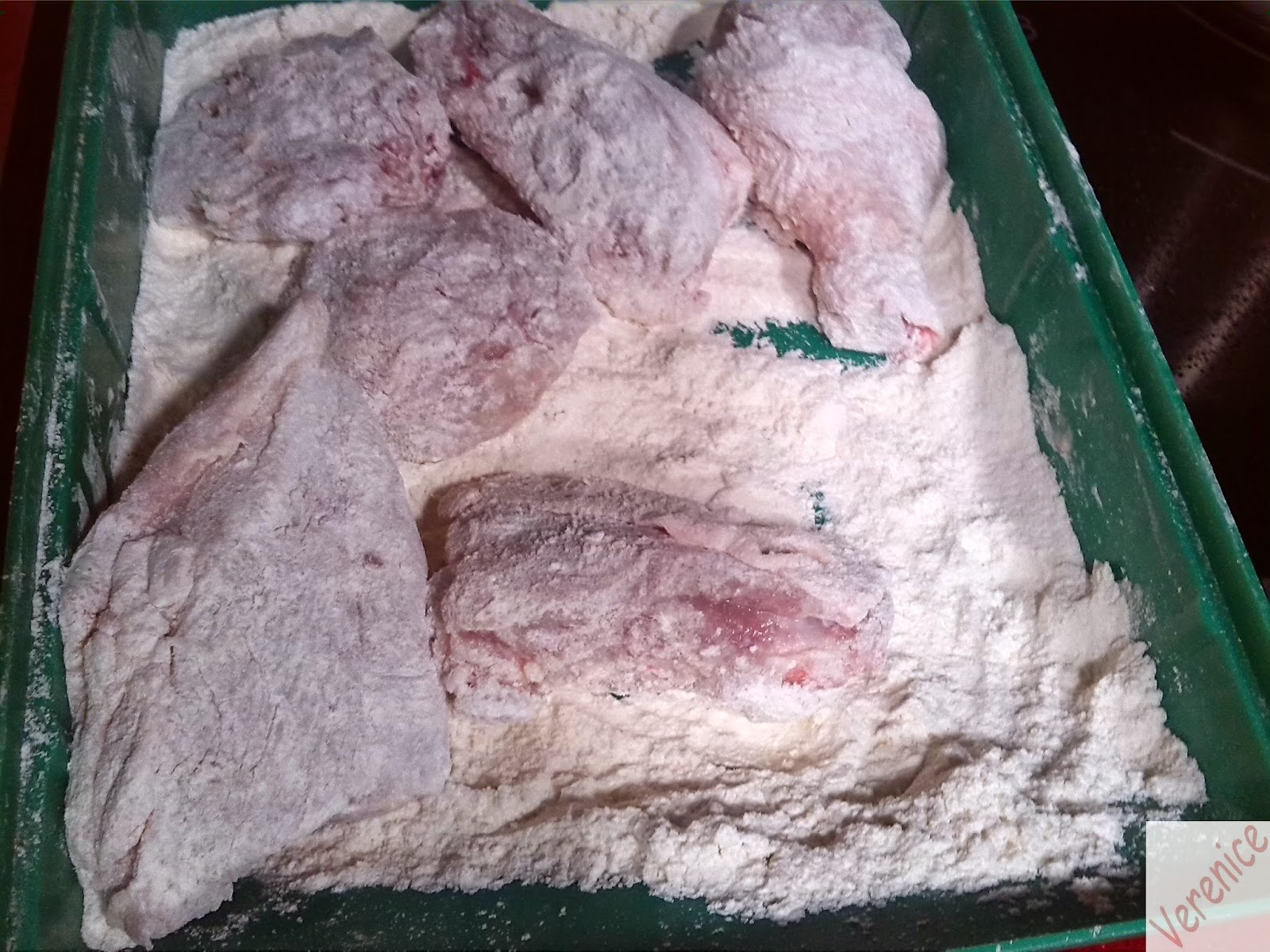 En un bol o cernidor ponemos la harina y colocamos los trozos de pollo, sazonamos de sal y pimienta y vamos enharinando