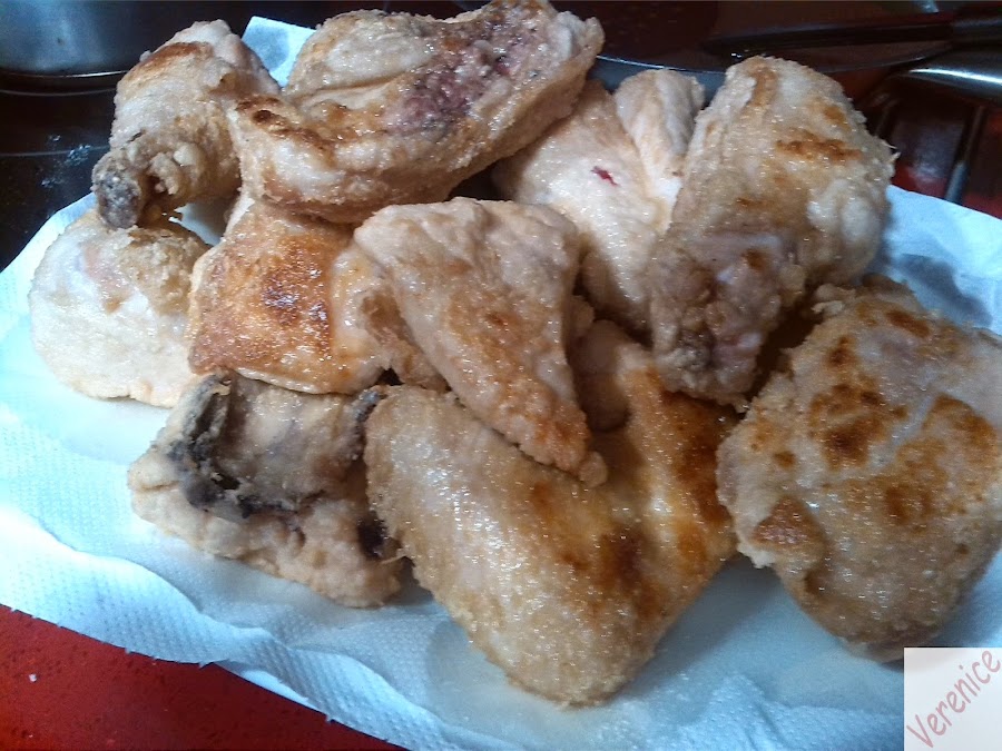 Limpiamos el pollo, ya troceado, y quitamos grasa y alones, lavamos bien y escurrimos sobre papel de cocina