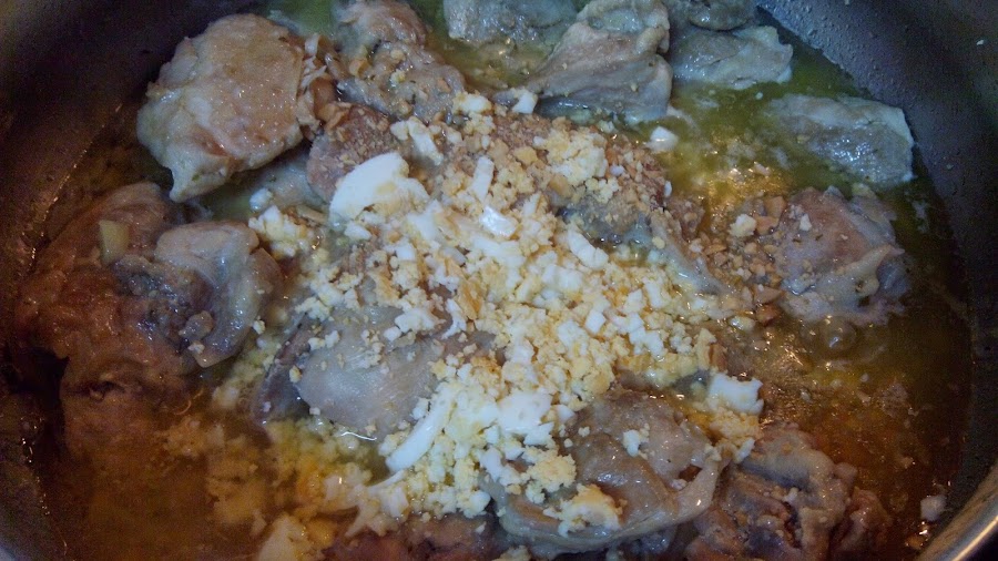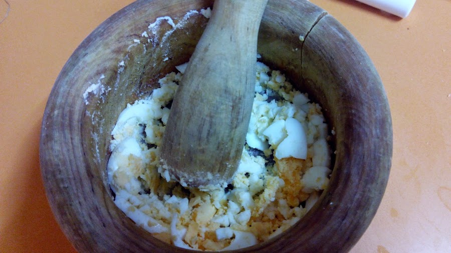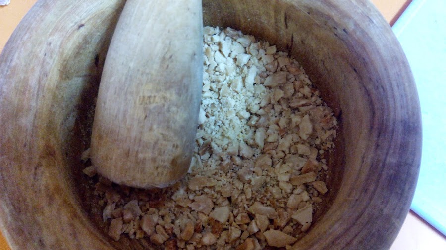 Dejaremos cocer una media hora. Mientras ponemos a cocer el huevo y cuando esté listo, lo machacamos en el mortero y también las almendras.
