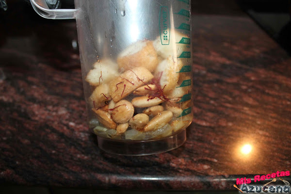 Solo nos falta añadir al vaso las hebras de azafrán junto con unos 200ml del caldo que tenemos preparado, lo batimos todo bien y reservamos.