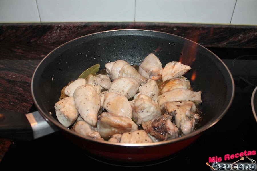 Ponemos una sartén honda al fuego, a fuego medio cuando este caliente añadiremos un fondo de aceite, añadiremos el pollo junto con las hojas de laurel, salpimentamos y dejamos sofreír durante 15 minutos, hasta dorar la carne.