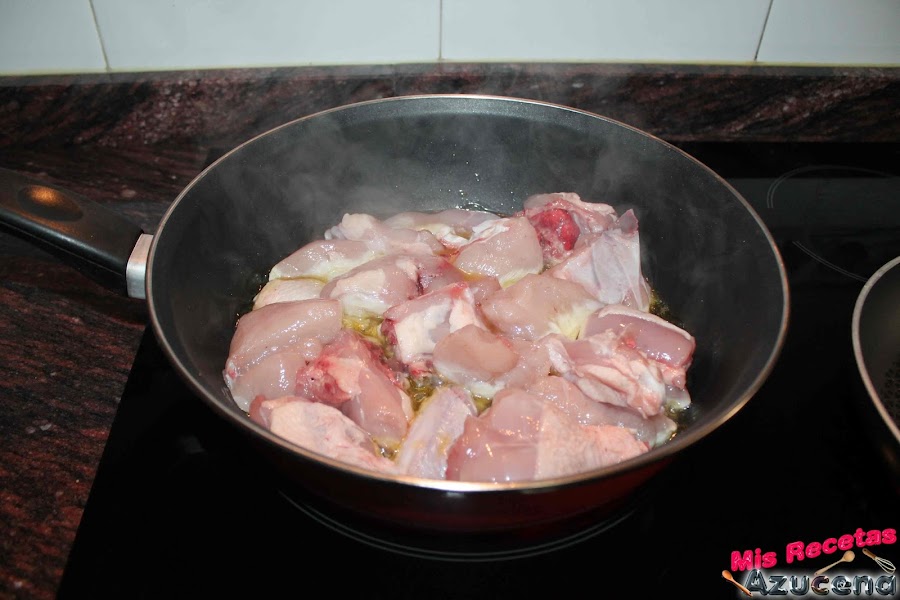 Lo primero que haremos en esta receta será trocear el pollo en trozos pequeños y le quitaremos la piel a los trozos que podamos, a los muslos y a las alas se la dejaremos.