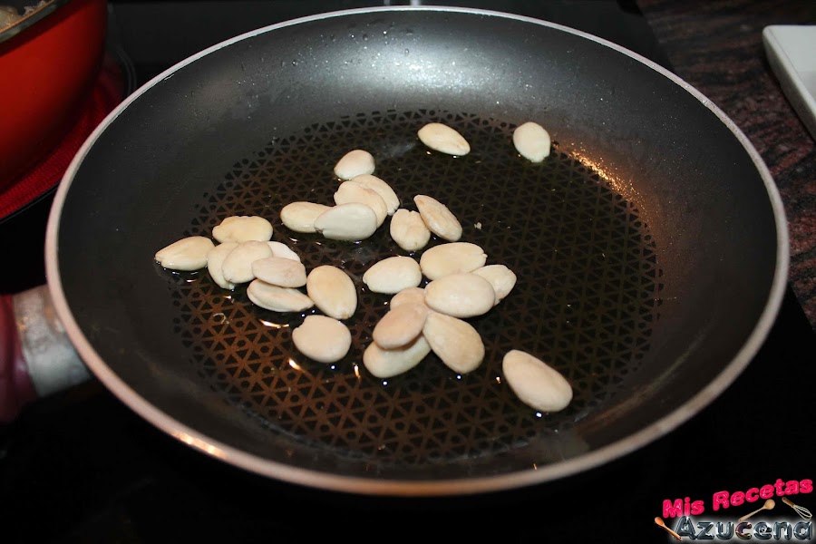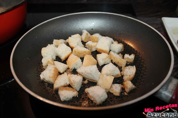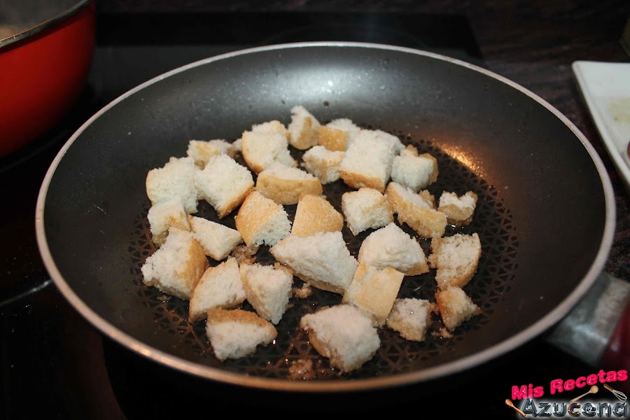 En ese mismo aceite pondremos a sofreír las almendras hasta dorarlas un poco, después las sacamos y las ponemos junto con los ajos. Continuemos con este misma sartén, esta vez añadiremos el pan y lo sofreímos hasta que se dore, y seguidamente lo pondremos en el mismo vaso donde tenemos los otros ingredientes.