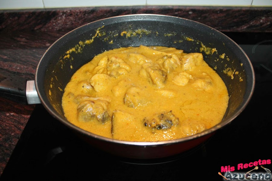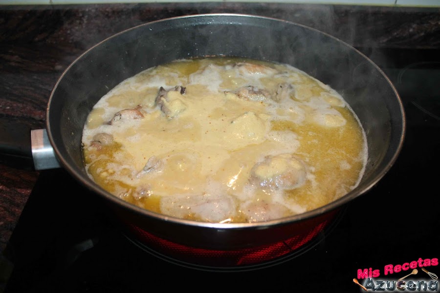 Cuando el vino este casi haya reducido del todo añadiremos a la sartén las pechugas de pollo que sacamos, el caldo de pollo y el majado que tenemos en el vaso de la batidora, mezclamos todo bien bajamos el fuego a fuego medio bajo y dejamos que se haga unos 30 minutos.