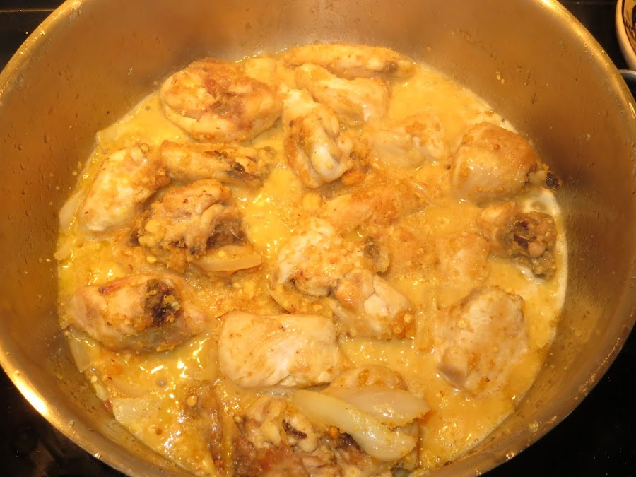 Una vez que la cebolla y el ajo se ha pochado bien, tardarán unos 15 minutos, añadimos el pollo que teníamos reservado el majado y los 150 mililitros de vino blanco. Subimos el fuego para que se evapore un poco el alcohol. Luego añadimos el vaso de agua y lo dejamos cocer todo a fuego medio bajo durante 25 minutos. Cuando veamos que está casi cocinado añadimos la clara del huevo cocida y listo para comer.