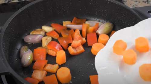 Cuando comiencen a coger color, añade las chalotas peladas y enteras. Dale unas vueltas y echa el pimiento rojo cortado en trozos medianos y la zanahoria pelada y cortada en rodajas.
