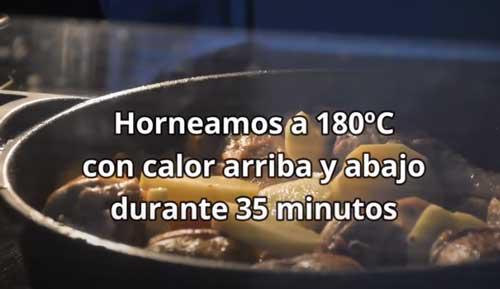 Ahora, lleva la cazuela al horno precalentado a 180ºC. Yo estoy usando una cazuela de hierro fundido que es apta para horno. Si la tuya es normal pasa todo a una fuente que sea apta para horno.