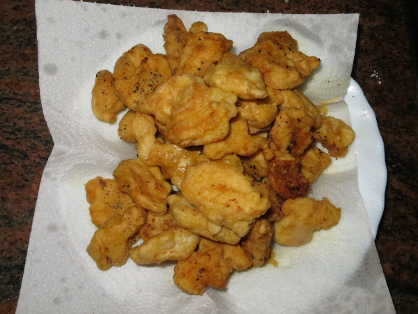 Mezclamos los huevos con la maicena, salpimentamos el pollo y lo rebozamos en el bol donde teníamos lo anterior. Una vez que lo tenemos bien rebozado, echamos aceite en una sartén y cuando esté bien caliente vamos dorando los trozos de pollo. Cuando ya los tengamos bien cocinados los sacamos a un papel absorbente.