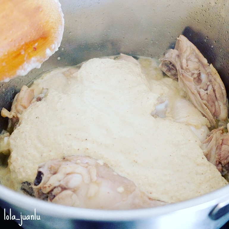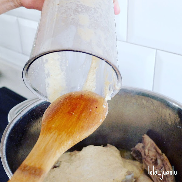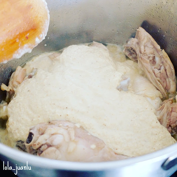 Agregamos el majado a la olla donde estamos dorando el pollo y añadimos dos tazas más de agua.