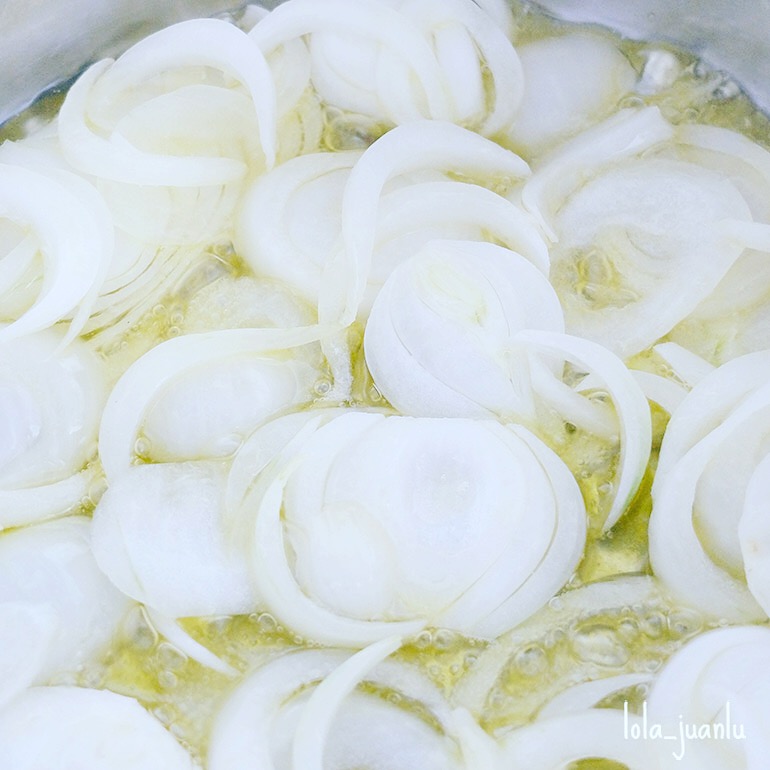 Freímos la cebolla en la olla con el mismo aceite y cuando esté dorada la retiramos.