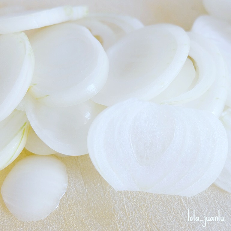 Pelamos y cortamos las cebollas en aros. Pelamos los ajos y los cortamos por la mitad. Reservamos.