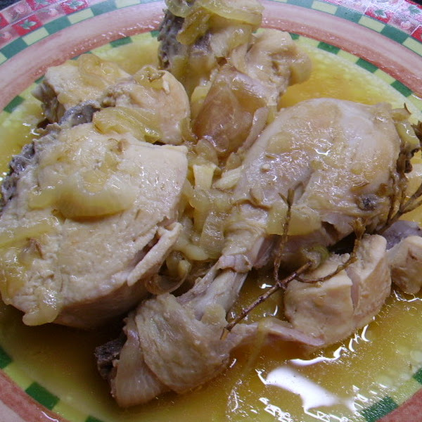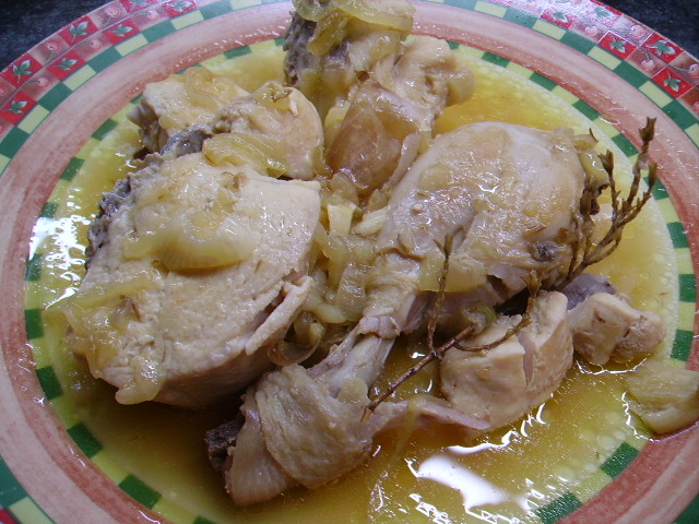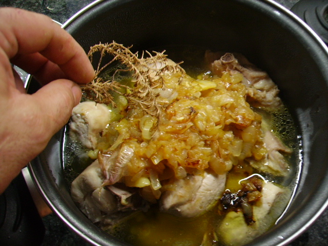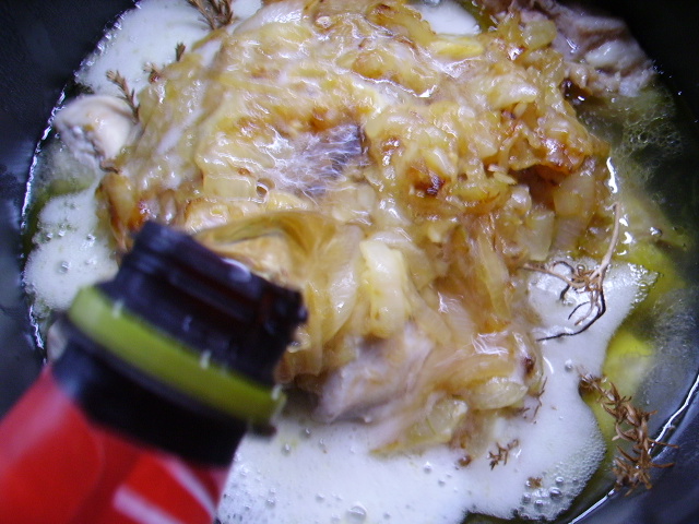 6.- Cuando esté dorada la cebolla la sumamos al pollo y añadimos un poco de cerveza y el tomillo.