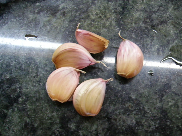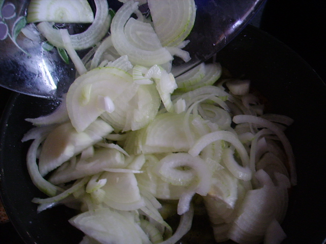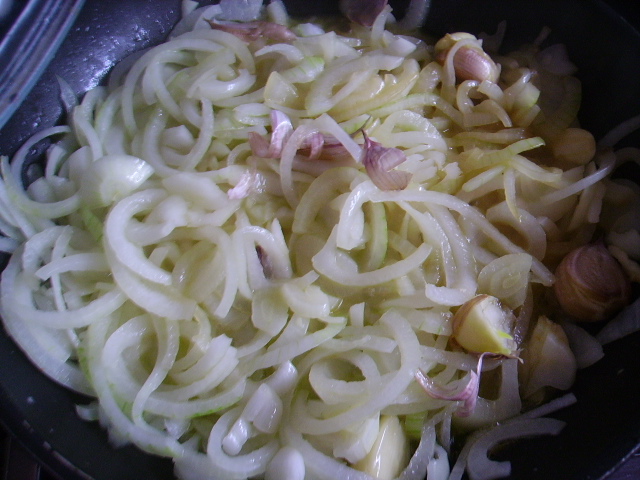 5.- Cortamos las cebollas en rodajas y machacamos los ajos con la piel y lo pochamos todo en el mismo aceite del pollo.