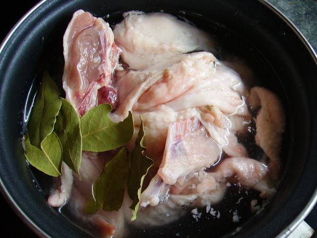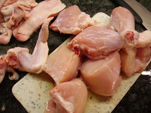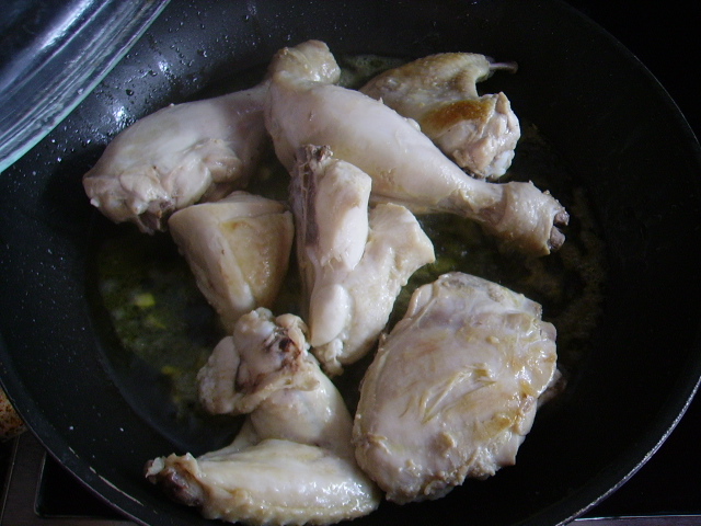 1.- Troceamos el pollo y le quitamos la piel y el caparazón, enjuagamos y salamos.