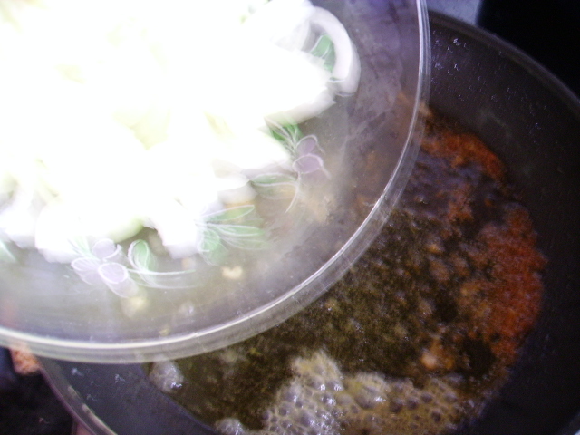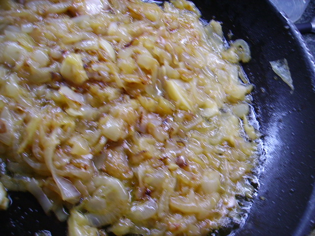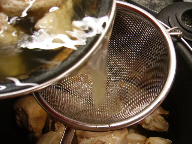 4.- Cuando esté dorado apartamos en una olla y agregamos el caldo colado.
